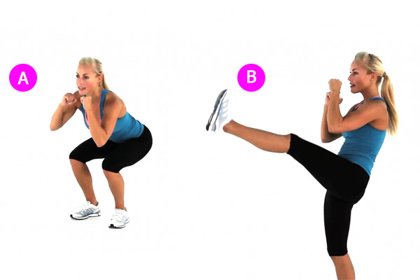 Встаньте прямо, ноги поставьте на уровне плеч. Руки сгибайте в локтях, чтоб кисти располагались на уровне груди, или же сомкните их замком. На выдохе ягодицы опускайте к полу. Учтите, что угол в колене должен быть тупым. Чтобы добиться этого, ягодицы в процессе приседа отведите назад. Опустившись максимально низко, поднимитесь и, не выдерживая паузу, выполните удар ногой вперед, направляя носок к себе. В следующем приседе мах делается второй ногой.