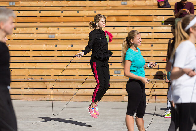 - Двойной прыжок. За один оборот скакалки нужно суметь сделать подпрыгивания два раза. Темп не делайте слишком высоким. Таким образом, вы сможете восстановить дыхание.