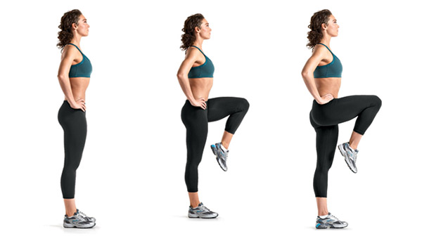 Это упражнение на растяжку сочетает обычные выпады с высоким подъемом коленей. Такая комбинация помогает добиться отличного динамического растяжения икр, ягодиц, подколенных сухожилий, сгибателей бедра.