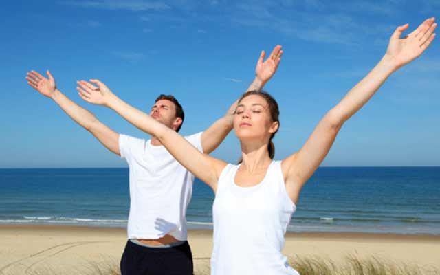 - Веселый танец. Упражнение делается из положения стоя, руки и плечевой пояс расслаблены, ноги сведены вместе. На вдохе сделайте шаг вперед с левой ноги, перенеся на нее вес тела. Левую ногу немного согните, правую перенесите на носок, согнутые руки в локтях отводятся влево и вперед. На выдохе вернитесь в исходное положение. Без паузы на следующем вдохе сделайте шаг уже другой ногой, повторив те же движения рук в противоположную сторону. Выдохнув, снова верните исходное положение.