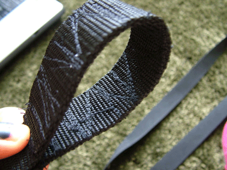 Полученную петлю складываем снова пополам и зашиваем у основания. Края нужно заплавить зажигалкой. Прострачиваем поперек, через каждые 5–6 сантиметров.